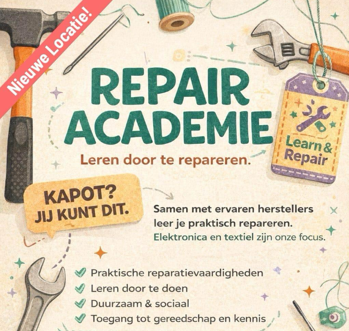 Repair ACADEMIE dinsdag 21 april 2026 18:30 21:00 Google Agenda ICS KOM LEREN REPAREREN Leer onder begeleiding van ervaren reparateurs je eigen apparaten, elektronica of kleding repareren! Geen ervaring nodig, geen aanmelding, gewoon binnenlopen! Inloop tussen 18:30-20:30, we sluiten om 21:00.